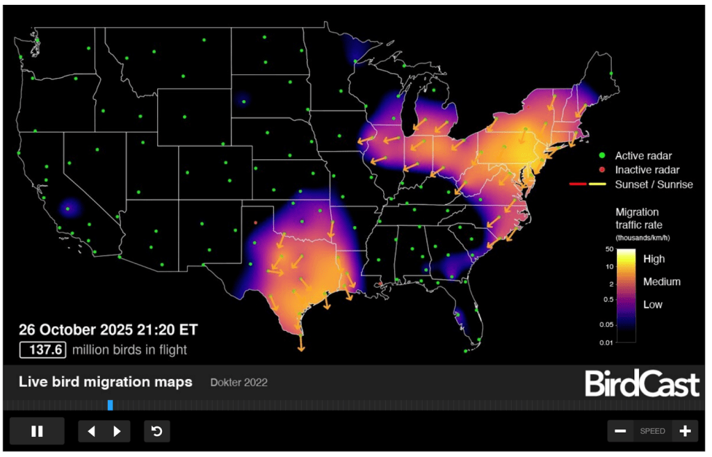 Research groups and universities around the world use radar technology to study bird movements, but BirdCast is the only platform in the US doing so publicly with weather radar. Bird populations across North America are in steep decline, and weather radar provides insights into large-scale bird migration that can inform conservation efforts and reduce collisions. More than a billion birds in the US die each year from collisions with buildings, and the stakes are even higher during massive migration nights like on October 8.